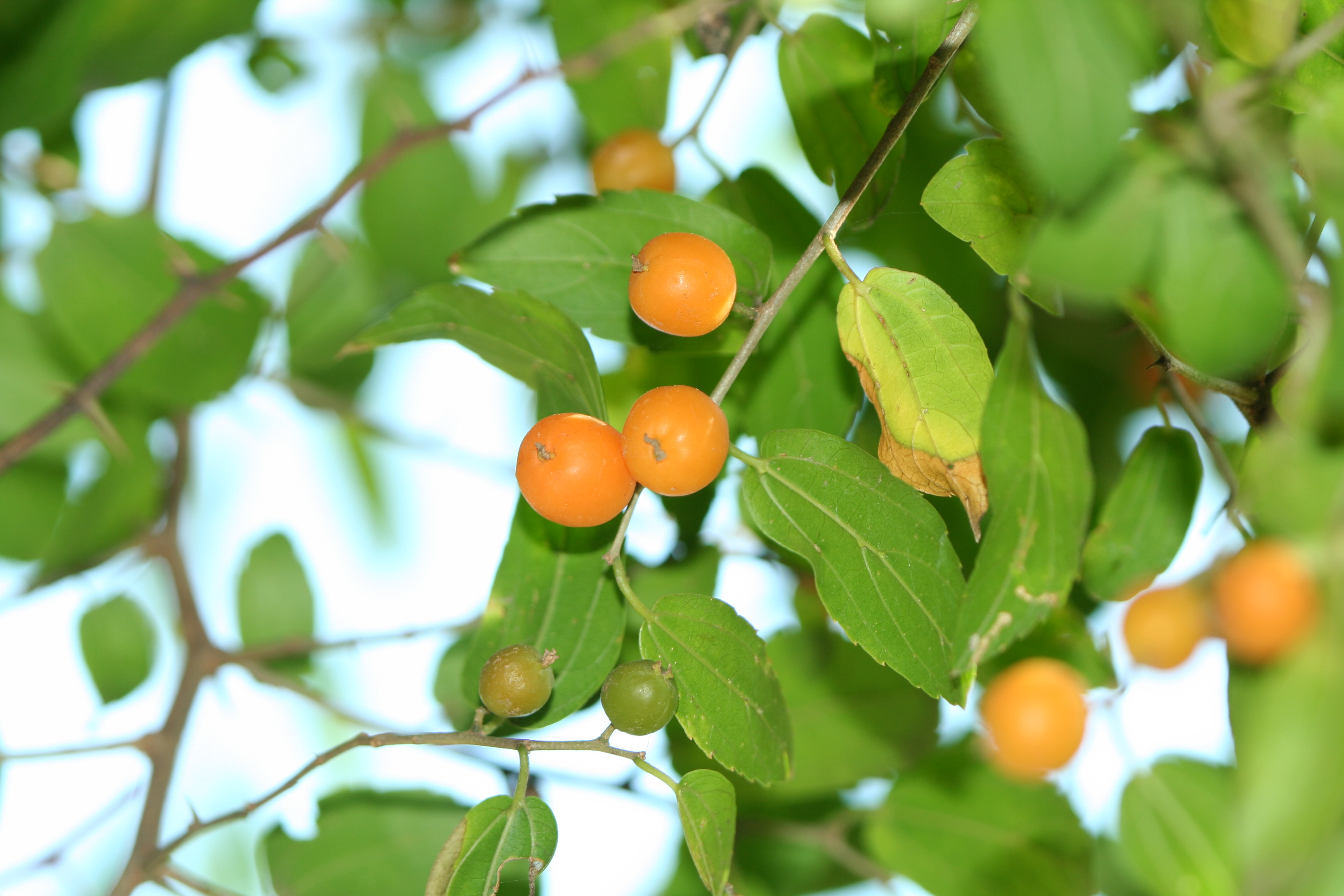 Árboles de hasta 20 m de alto; corteza rugosa, fisurada, grisácea; ramas en zig zag, espinosas. Hojas con pecíolo; láminas ovadas y su ápice atenuado, los márgenes enteros o aserrados con dientes desde el tercio medio hasta el ápice o restringidos al tercio superior, base cuneada. Sus flores son muy pequeñas de color verdosas o amarillentas. Presenta flores hermafroditas en posición apical de la inflorescencia y flores estaminadas (flores con estambres) en la base. El fruto es una drupa ovoide carnosa, de 1-1,5 cm de diámetro de color anaranjado a la madurez (con una semilla por fruto).Florece en primavera. Fructifica entre primavera y otoño.